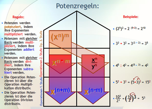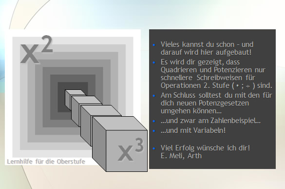 Grundlage: Grundfertigkeiten Mathe Oberstufe Grundkenntnisse in Algebra Stichworte: Basis, Exponent, Faktor, Hierarchie der Operationen, Hochzahl, Kubikzahl, Potenz, Potenzregeln, Quadratzahlen, Summand Ausblick: Negative Zahlen Übungen: Aufgabenfuchs-A B C