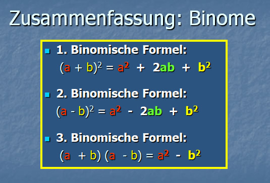 Grundlage: Algebraische Grundkenntnisse Grundfertigkeiten Mathe Oberstufe Stichworte: Binomische Formel, Malkreuz, Rechteck, Struktur der drei Binome, Term Ausblick: Pascalsches Dreieck Übungen: Aufgabenfuchs Algebra in Q Lösungen