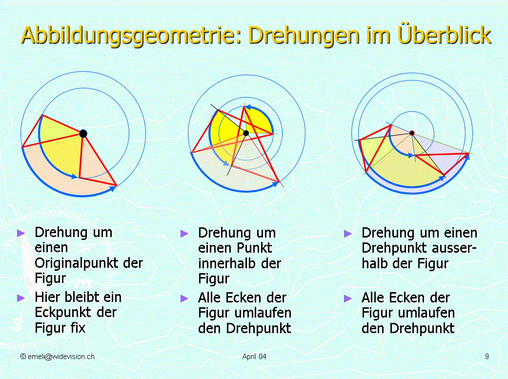 Grundlage: Handhabung der geometrischen Zeichengeräte Stichworte: Drehsinn, Drehwinkel, Drehzentrum, Fixkreis, Fixpunkt Ausblick: Rollen und Räder Übungen: Geogebra